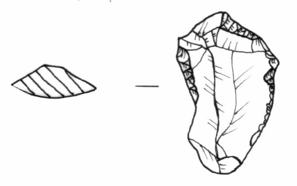 Ritocco semierto, invadente, diretto, continuo, frontale. Ritocco semierto, marginale, diretto sulla porzione distale dei margini laterali. Margini convergenti al basso.