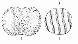 Ciottolo con profilo ovale e ampia solcatura mediana. Le due calotte sono lavorate al fine di rendere simmetrica la forma.