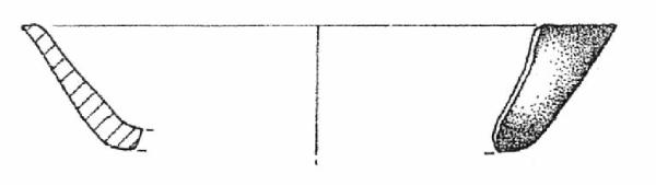 Orlo assottigliato, corpo carenato con parete rettilinea esoversa e vasca poco profonda. Superficie di colore grigio molto scuro (5 Y 3/1).