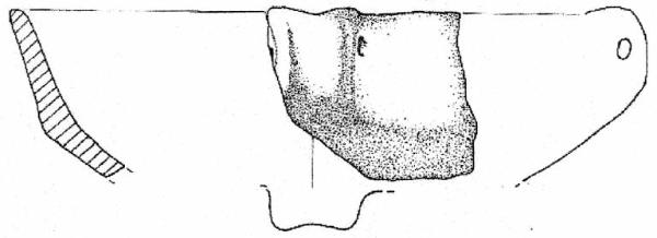 Orlo piatto, corpo carenato con vasca mediamente profonda e parete rettilinea esoverso, ansa canaliculata con apici leggermente insellati, impostata tra orlo e carena. Superficie di colore giallo pallido (2,5 Y 7/4).