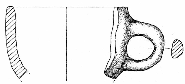 Orlo arrotondato, corpo profilo convesso, fondo assente. Ansa ad anello, sezione nastriforme, impostata sotto l'orlo. Superficie di colore grigio rosa (7,5 Y 6/2).