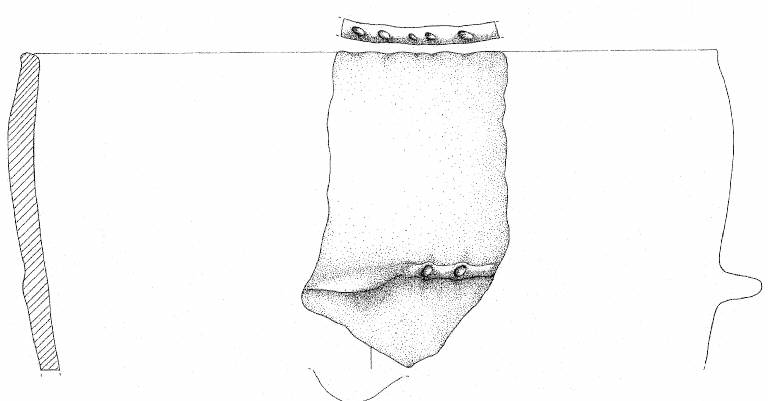 Orlo a tacche, debolmente esoverso, parete convessa con cordone a tacche orizzontale e presa a linguetta orizzontale, impostati a centoquattordici mm sotto l'orlo. Superficie di colore bruno grigio (10 YR 5/2).