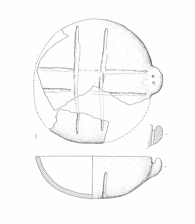 Profilo emisferico con prese a lingua con due fori passanti verticali; fondo a calotta decorato a solcature parallele e ortogonali tra loro formanti un motivo cruciforme.