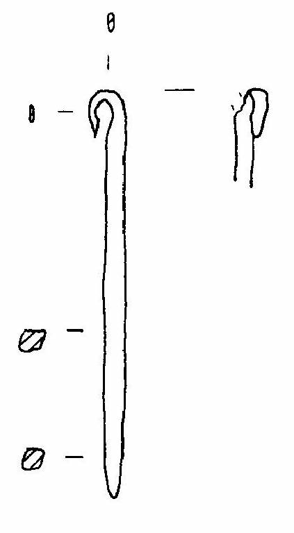 Lesina a sezione quadrangolare, con capocchia ripiegata ad uncino. La superficie presenta una patina verde.