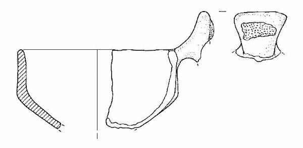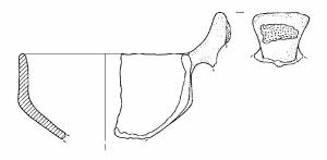 Capeduncola con orlo arrotondato, corpo carenato a parete rettilinea, con diametro all'orlo uguale al diametro alla carena, vasca troncoconica, ansa a nastro verticale, soprelevata, ad ascia, con margine leggermente convesso, impostata sull'orlo. Sull'ansa c'è un'incrostazione di colore marrone.