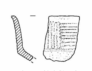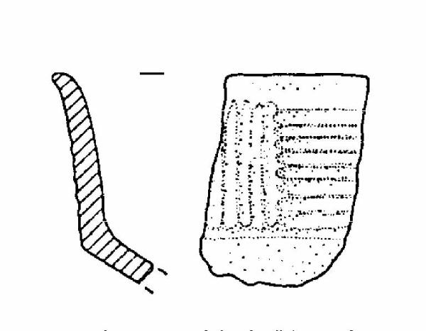 Frammento di capeduncola, con orlo assottigliato ed estroflesso, corpo carenato, a parete rettilinea, con diametro all'orlo maggiore del diametro alla carena, vasca troncoconica. Il corpo è decorato da cinque solcature parallele e verticali e da otto solcature parallele e orizzontali.