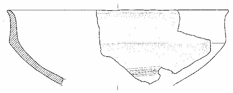 Scodellone a profilo articolato, con orlo assottigliato ed estroflesso, corpo carenato a parete rettilinea, con diametro all'orlo maggiore del diametro alla carena, vasca a calotta. Sotto la carena ci sono alcune sottili solcature parallele. Colore bruno molto pallido.