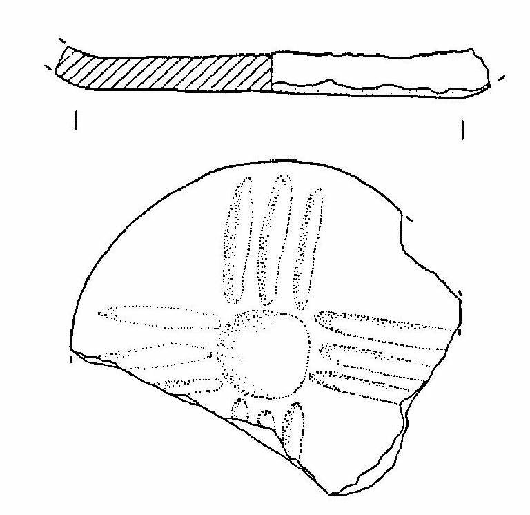 Fondo piatto di scodellone, decorato esternamente da un motivo cruciforme, composto da solcature e da una grande coppella centrale.