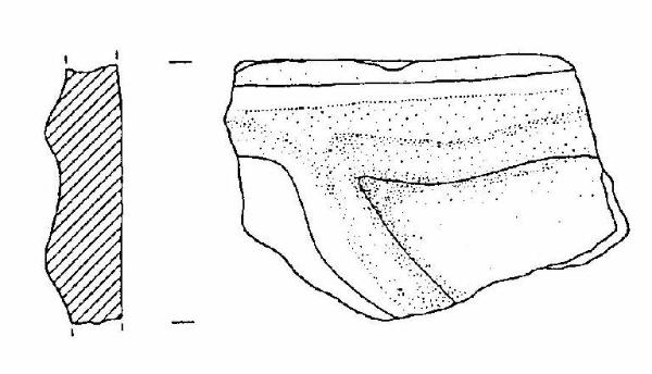 Frammento di parete di dolio, con due cordoni plastici lisci, che si intersecano, uno orizzontale, uno obliquo. Colore grigio chiaro.