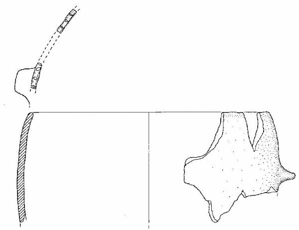 Frammento di vaso con orlo arrotondato ed inclinato verso l'interno, decorato ad impressioni digitali, corpo ovoide. Vi è una presa a linguetta, impostata ottantacinque mm sotto l'orlo.