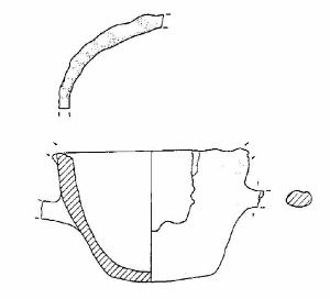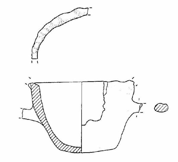 Tazza con orlo arrotondato, decorato ad impressioni digitali, corpo troncoconico, a parete leggermente convessa, fondo convesso; sono visibili gli attacchi di due anse soprelevate a sezione ovaleggiante, impostate sull'orlo e a metà del corpo, diametralmente opposte.