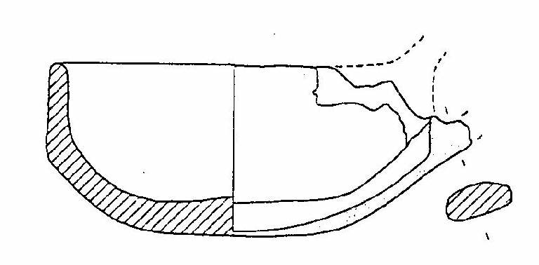 Capeduncola con orlo arrotondato, corpo carenato, a parete rettilinea, con diametro all'orlo leggermente minore del diametro alla carena, fondo piatto; si conserva l'attacco inferiore di un'ansa a nastro verticale, presumibilmente soprelevata.