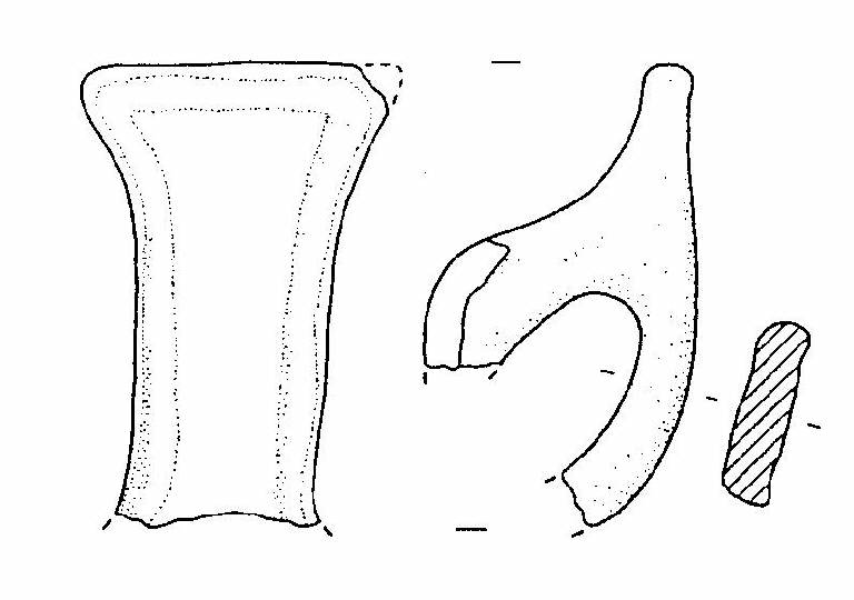 Frammento di ansa a nastro verticale, soprelevata, ad ascia, con margine superiore rettilineo ed apici sviluppati. La faccia esterna dell'ansa è contornata da una solcatura.
