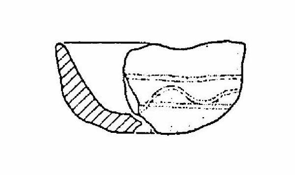 Scodella a profilo continuo, con orlo assottigliato, corpo a calotta, fondo convesso; sul corpo ci sono due sottili solcature orizzontali, che delimitano una fascia decorata da una solcatura con andamento a festone.