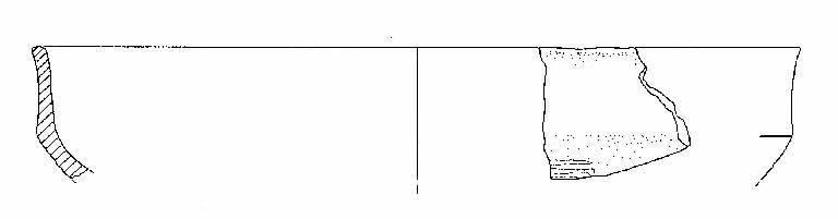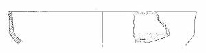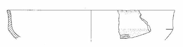 Scodellone a profilo articolato, con orlo piatto e lievemente estroflesso, corpo carenato, a parete leggermente concava, con diametro all'orlo maggiore del diametro alla carena, vasca troncoconica. Sotto la carena si intravede un motivo a sottili solcature.