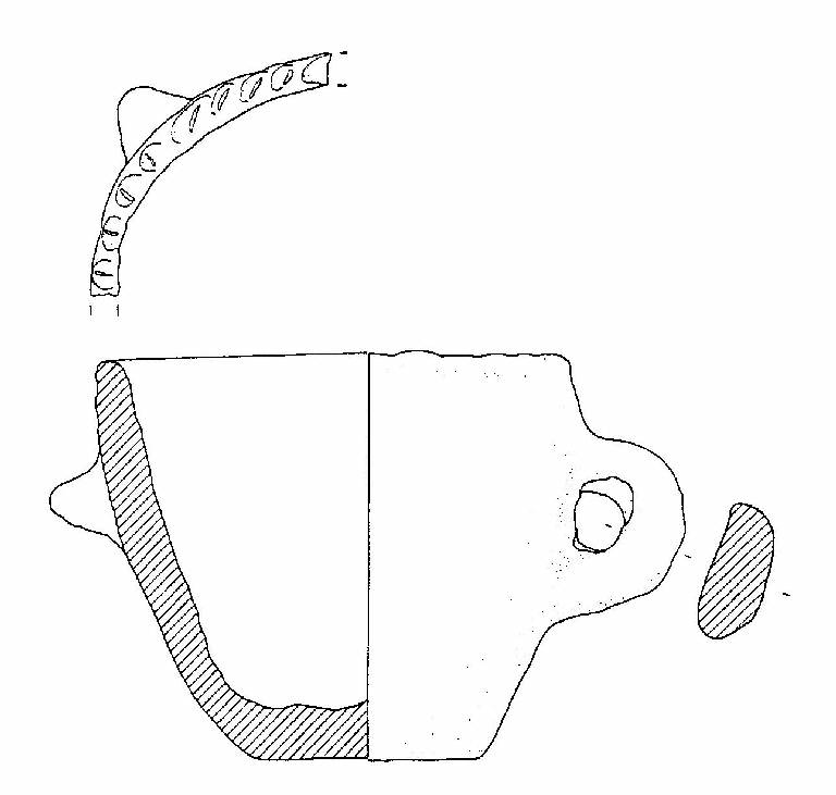 Boccale con orlo arrotondato, decorato ad impressioni digitali e ad unghiate, corpo troncoconico, a parete leggermente convessa, fondo piatto; ansa a nastro verticale, ad orecchio, impostata diciotto mm sotto l'orlo; c'è una presa conica in posizione diametralmente opposta all'ansa.