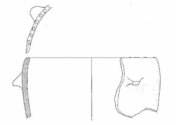 Vaso con orlo arrotondato, decorato ad impressioni digitali, corpo troncoconico a parete convessa; ventisette mm sotto l'orlo è impostata una presa a linguetta, rivolta verso il basso.