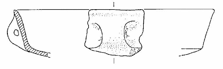 Scodella a profilo articolato, con orlo arrotondato e leggermente estroflesso, corpo carenato, a parete rettilinea, con diametro all'orlo maggiore del diametro alla carena, vasca troncoconica, ansa canaliculata, impostata sei mm al di sotto dell'orlo. Sotto la carena si intravedono tre solcature parallele.