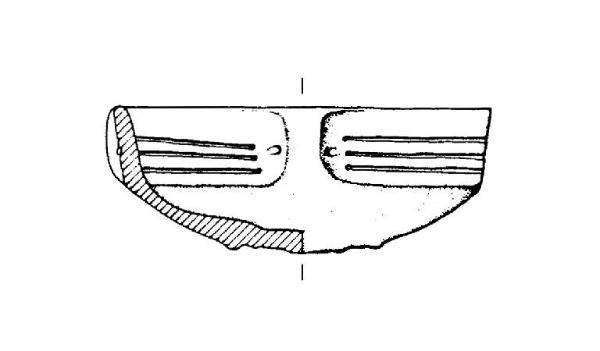 A profilo articolato. Orlo arrotondato. Corpo carenato a parete rettilinea, con diametro dell'orlo leggermente maggiore del diametro della carena. Vasca troncoconica. Fondo esterno lacunoso. Fondo interno ombelicato. Ansa canaliculata impostata sull'orlo e sulla carena. Decorazione a solcature orizzontali e parallele sulla parete. Colore: grigio, con chiazze.