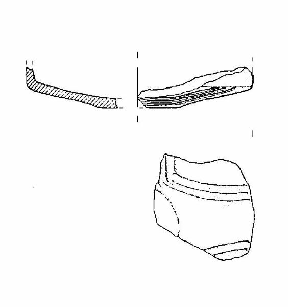 A profilo articolato. Frammento carenato con vasca troncoconica e fondo piatto. Decorazione a solcature al di sotto della linea di carena. Colore: grigio scuro.