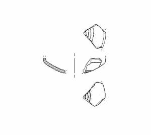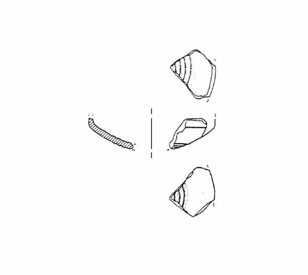 A profilo articolato. Frammento carenato con vasca a calotta decota sia internamente sia esternamente da solcature concentriche. Colore: grigio scuro.