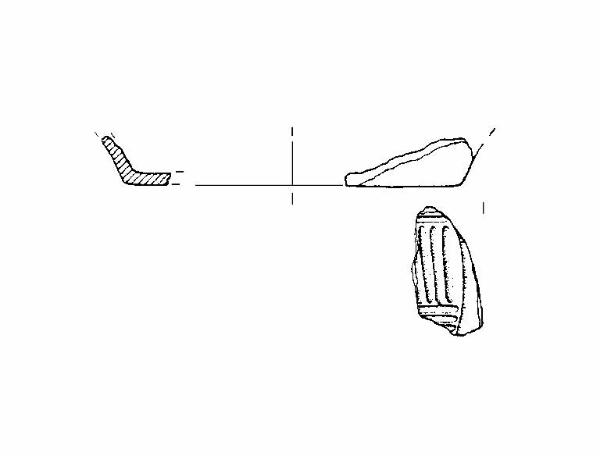 Vasca forse troncoconica con fondo piatto, decorato esternamente da fasci di solcature tra loro perpendicolari. Colore: grigio scuro.