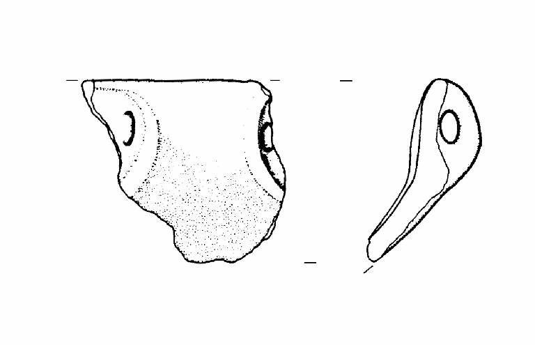 A profilo articolato. Orlo arrotondato. Parete verosimilmente rettilinea. Vasca forse troncoconica. Ansa canaliculata impostata sull'orlo e sulla carena. Colore: grigio.
