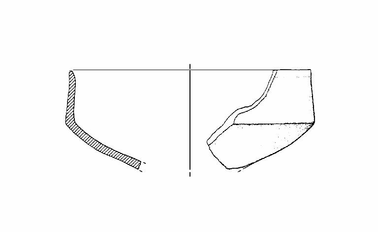 A profilo articolato. Orlo arrotondato e leggermente assottigliato. Corpo carenato a parete rettilinea, con diametro dell'orlo inferiore al diametro della carena. Vasca troncoconica. La carena si presenta netta. Colore: grigio scuro, con chiazze.