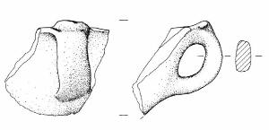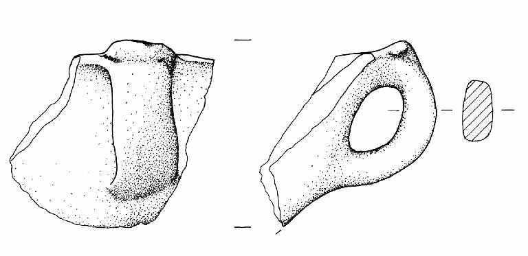 Profilo ad orecchio ed apicatura irregolare leggermente soprelevata rispetto all'orlo. E' impostata tra orlo e massima espansione di una tazza con orlo esoverso assottigliato arrotondato, conservata solo per un piccolo frammento.