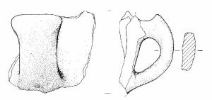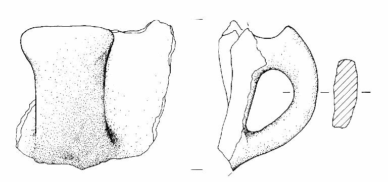 Profilo a gomito con leggera apicatura asciforme debolmente espansa lateralmente. Sezione subrettangolare. Superficie di colore disomogeneo, grigio chiaro, scuro e beige.