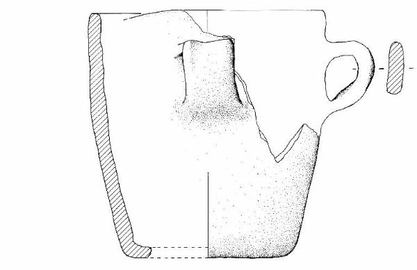 Corpo troncoconico a profilo leggermente convesso, con orlo arrotondato e fondo piatto. Ansa ad orecchio con il ponticello superiore leggermente insellato impostata a circa tre quarti dell'altezza. Colore grigio.