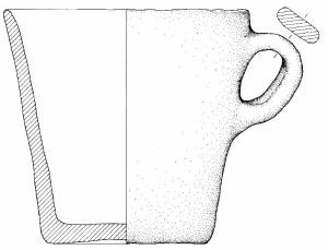 Profilo diritto, orlo arrotondato e fondo leggermente concavo. Ansa a nastro con profilo ad orecchio impostata a circa tre quarti dell'altezza. Superficie di colore disomogeneo, grigio scuro/nero e beige.