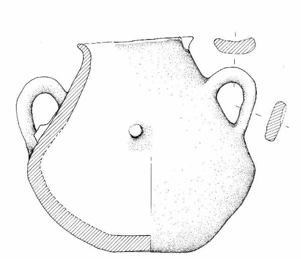 Corpo biconico, con bassa carena arrotondata, parete superiore a profilo rettilineo, orlo esoverso arrotondato, fondo leggermente concavo. Due anse ad orecchio, una appena insellata all'apice, l'altra leggermente deformata per ipercottura, sono impostate da metà circa della parete superiore a poco sopra la massima espansione. Decorazione costituita da due bugne circolari contrapposte e alternate alle anse, poste alla massima espansione. Colore grigio scuro con colpi di fiamma arancio/beige.