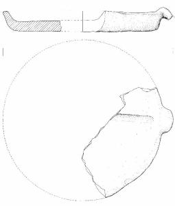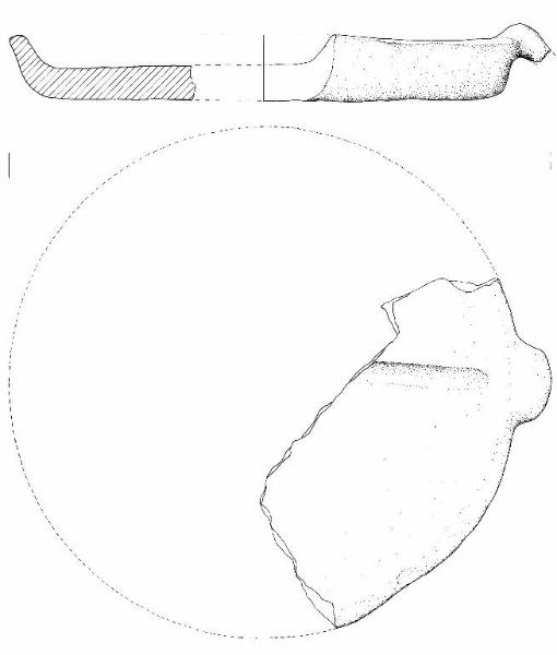 Bassa parete svasata, orlo arrotondato, in alcuni punti appiattito superiormente, presa spezzata applicata all'orlo e fondo piatto. Un motivo cruciforme, di cui si conserva solo una porzione di un braccio, è impresso a solcatura sul fondo interno. Colore beige con colpi di fiamma grigi.