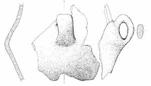 Corpo biconico con parete superiore a profilo leggermente concavo e orlo leggermente esoverso arrotondato, conservato per un frammento non ricomponibile. Si conserva una sola ansa ad orecchio impostata da circa metà della parete superiore alla massima espansione. Colore grigio scuro con colpi di fiamma arancio.