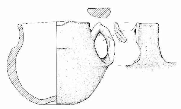 Corpo globoso/piriforme con risega, parete distinta leggermente concava e orlo appiattito nella parte superiore e leggermenteingrossato all'esterno . Fondo concavo. Ansa a gomito insellata impostata da poco sotto l'orlo alla massima espansione. Colore grigio scuro con colpi di fiamma grigio chiari.