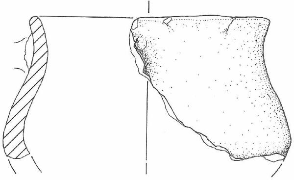 Orlo arrotndato su labbro verticale, corpo a profilo globoso leggermente schiacciato con max espansione a circa metà dell'altezza, base convessa o piano-convessa non conservata. \nSi conserva un accenno dell'innesto superiore dell'ansa sulla parete, appena sotto l'orlo. Colore: bruno-nero.
