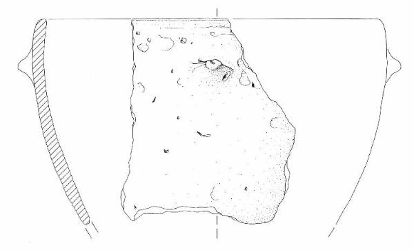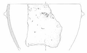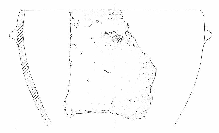 Orlo piatto, il tratto della parete conservato restituisce un corpo complessivamente troncoconico svasato con andamento della parete decisamente convesso, base piana non conservata.\nReca una presetta/bugnetta conica applicata poco sotto l'orlo. Colore: bruno-nero.
