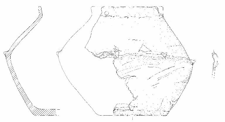 Orlo su colletto verticale (solo a tratti leggermente svasato) piatto a spigoli arrotondati liscio, corpo a profilo biconico, articolato in corrispondenza della max espansione da una risega ben sagomata. \nSi conservano due prese orizzontali trapezoidali in lieve sporgenza, con gli apici sottoposti a forte erosione in corrispondenza della risega e ottenute a partire da leggermente pizzicatura dell'impasto argilloso fresco a distanza reciproca di circa 100 gradi: la loro posizione suggerisce la presenza sul recipiente di quattro elementi di presa posti a intervalli di circa 90 gradi. \nColore: da camoscio a grigio a bruno scuro, con ampie focature da grigio scuro a arancio rosato.