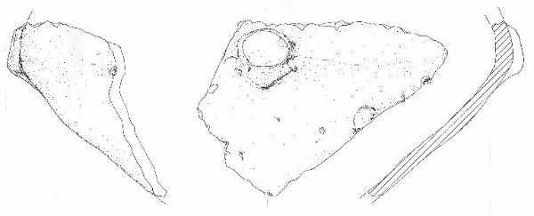 Orlo collo non conservati, si conservano parte del ventre e della spalla restituenti un profilo complessivamente biconico a spalla arrotondata, base non conservata.\nSulla max espansione si conserva applicata una presa/decorazione a larga e bassa pastiglia cilindrica con la faccia leggermente rivolta verso l'alto. Colore: da grigio a marrone con focatura arancio.