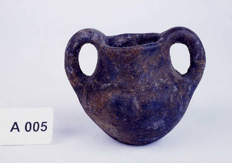 Corpo apodo ovoidale con nervature, collo a profilo concavo, anse a bastoncello leggermente sormontanti.