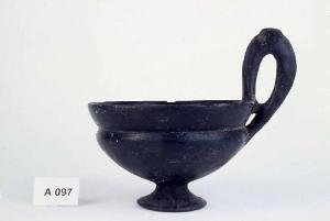 Piede a tromba, vasca a pareti rientranti con orlo svasato, ansa bifora sormontante con bottone alla sommità. (RASMUSSEN T. 4b)