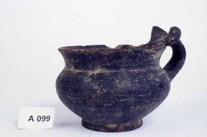 Piede ad anello, corpo a pereti convesse con orlo svasato e ansa leggermente sormontante con appendici laterali all'attacco.