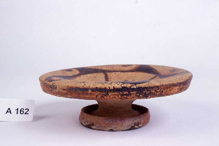 Piede ad anello a margine superiore rilevato, vasca circolare poco profonda con largo orlo. Decorazione a vernice nera:sull'orlo motivo ad onda, sul fondo decorazione a stelle.