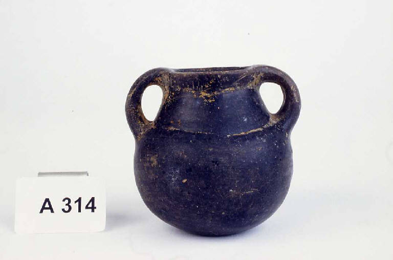 Corpo apodo globulare, collo a profilo concavo, con orlo svasato e anse a nastro ingrossato.
