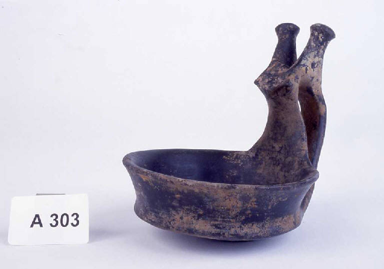 Vasca apoda con carenatura accentuata e ansa a nastro ingrossato sormontante con appendice superiore a corna di lumaca.