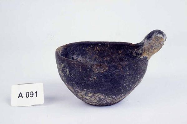 Vasca apoda svasata con orlo leggermente rientrante e ansa a bastoncello impostata orizzontalmente all'orlo e poco sormontante.