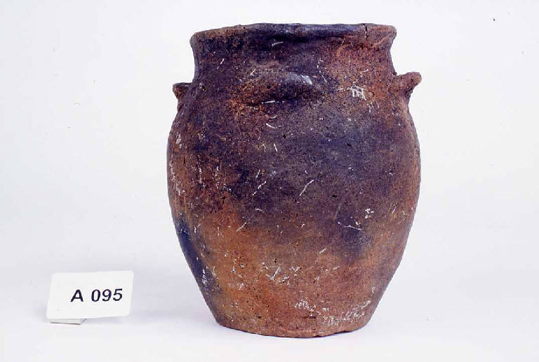 Fondo piatto, corpo ovoidale leggermente svasato al margine superiore con bugne poco sotto l'orlo.