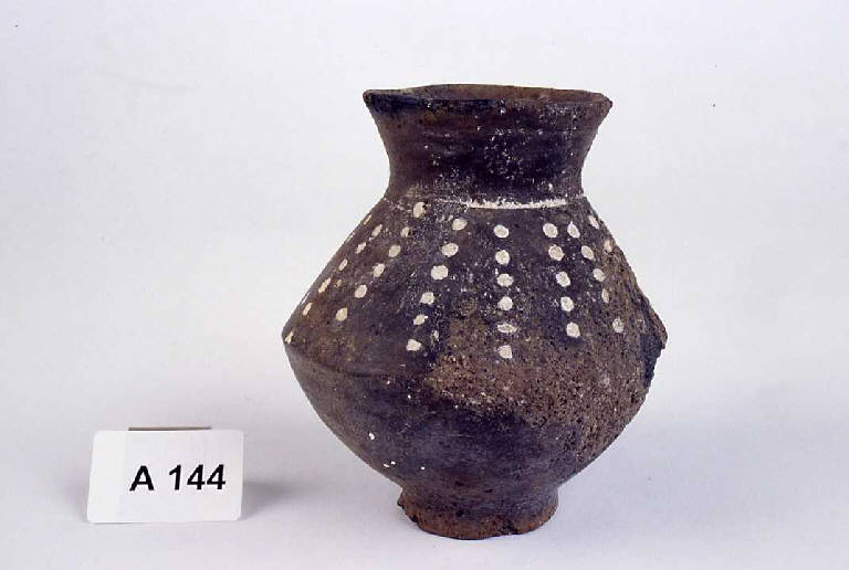 Piede a disco, corpo biconico con alto orlo poco svasato.Decorazione a file di punti verticali impressi e riempiti in bianco sul corpo.
