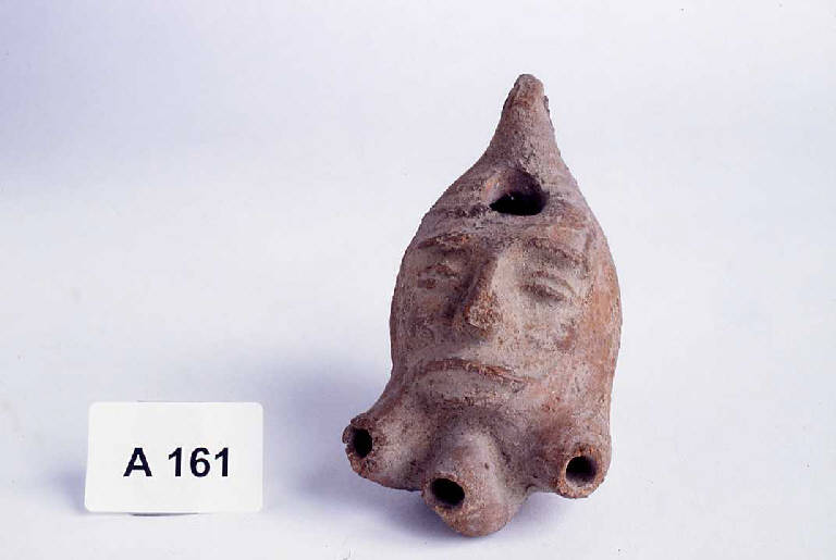 Lucerna a tre becchi corto e rotondo. Corpo configurato a maschera grottesca.